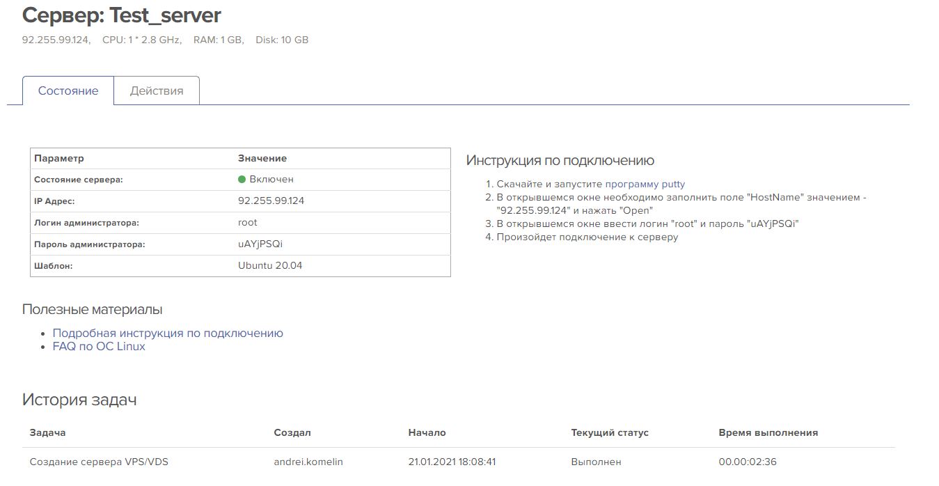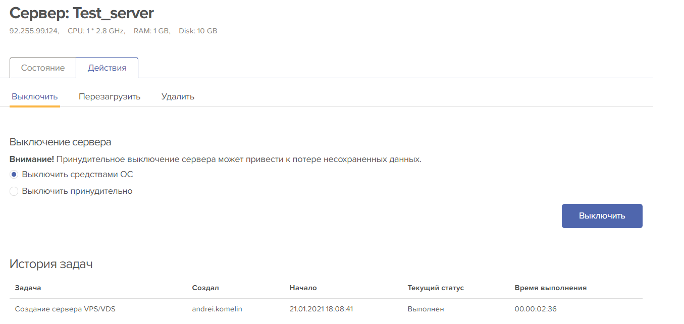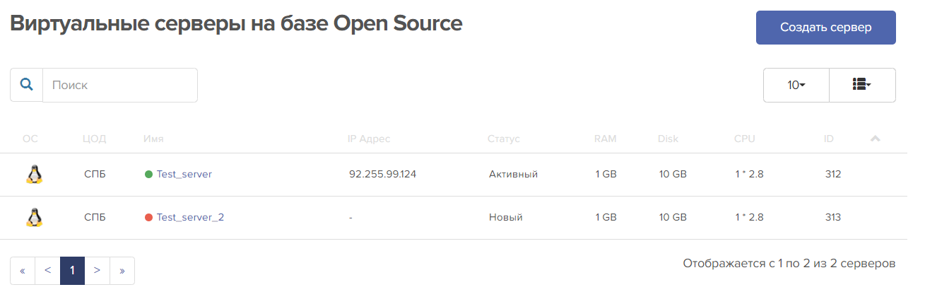 После создания Виртуального сервера в разделе «VPS/VDS на базе Open Source» будет доступен список созданных серверов: