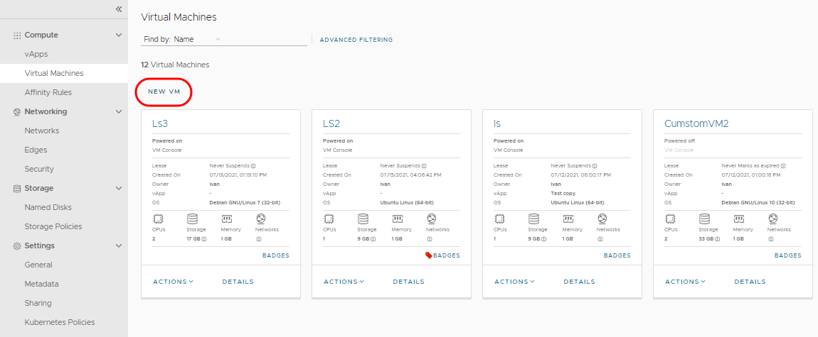 Создать виртуальную машину просто, достаточно нажать на кнопку NEW VM, находящуюся над блоком карточек VM.