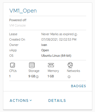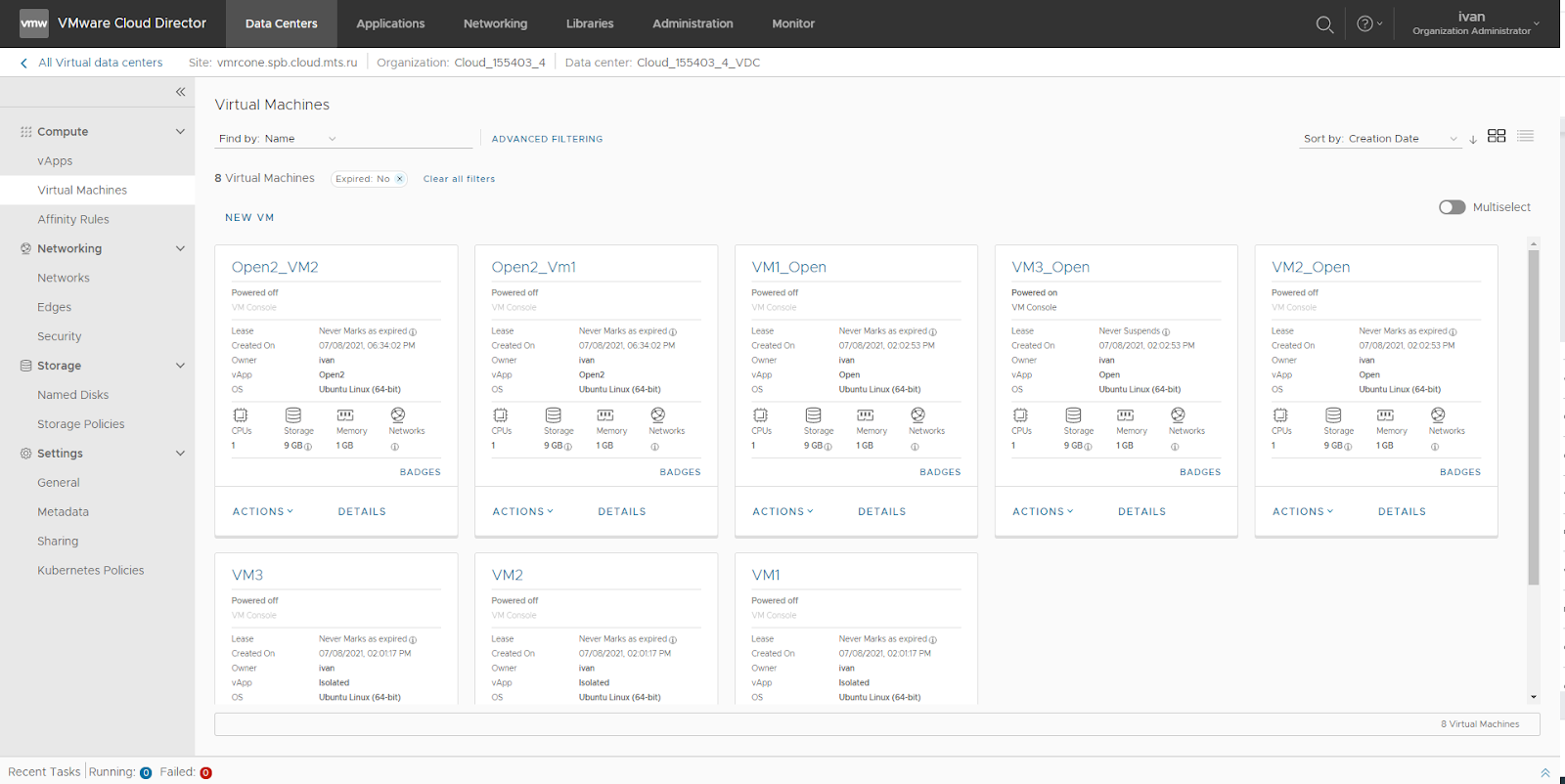 Созданные виртуальные машины отображаются в виде карточек с подробной информацией о них. Карточки VM расположены в разделе Virtual Machines.