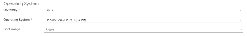 В блоке Operation System необходимо заполнить два автозаполняемых поля: OS family — семейство ОС (*nix или Windows) и Operating System — ОС. В поле Boot image необходимо выбрать ISO-образ, загружаемой ОС.