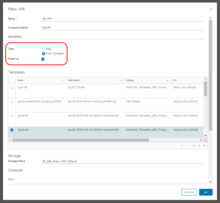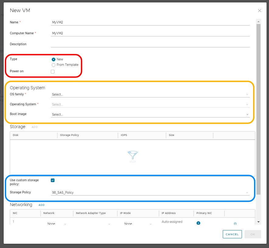 Преимущество такого подхода в скорости создания готовой и преднастроенной виртуальной машины. Достаточно ввести название VM (Name) и имя компьютера (Computer Name, имя не должно содержать пробелы и спецсимволы), выбрать нужный шаблон и политику хранения данных.