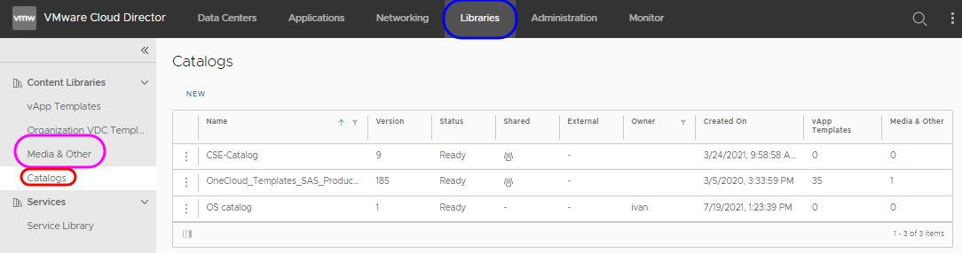 Для загрузки собственного ISO-образа — перейдите в раздел Libraries → Catalogs и создайте новый каталог. Затем перейдите в раздел Media & Other и загрузите ISO-образ.