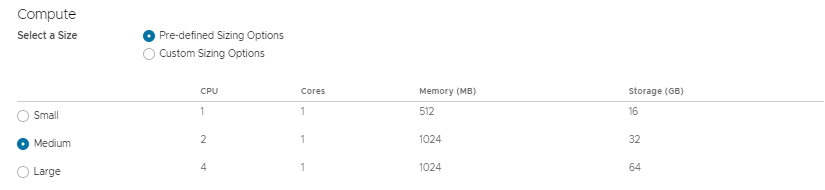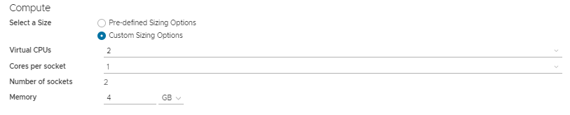 После заполнения блока Operation System развернется блок Compute. В блоке можно выбрать режим выдачи ресурсов: Pre-defined Sizing Options — предопределенный набор ресурсов или Custom SIzing Options — настраиваемый размер, выдаваемых ресурсов.