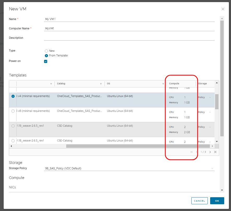 По умолчанию первым столбцом идёт ОС. Если вам необходимо выбрать шаблон по конфигурации — сместите горизонтальную прокрутку вправо до столбца Compute.