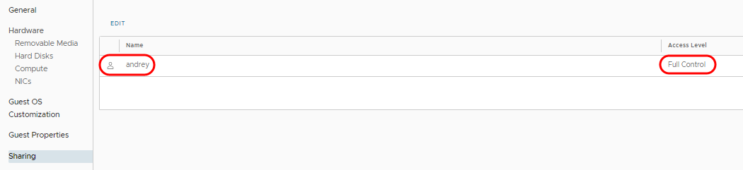 Раздел содержит настройки доступа к VM. Администратор может установить определенные права доступа к VM для разных пользователей и групп пользователей.