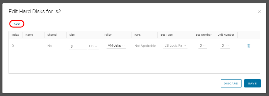 Вы можете просмотреть, используемые диски, изменить их размер, политики использования, задать дискам Bus и Unit адреса, подключить дополнительные диски, если это необходимо.