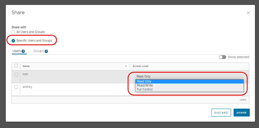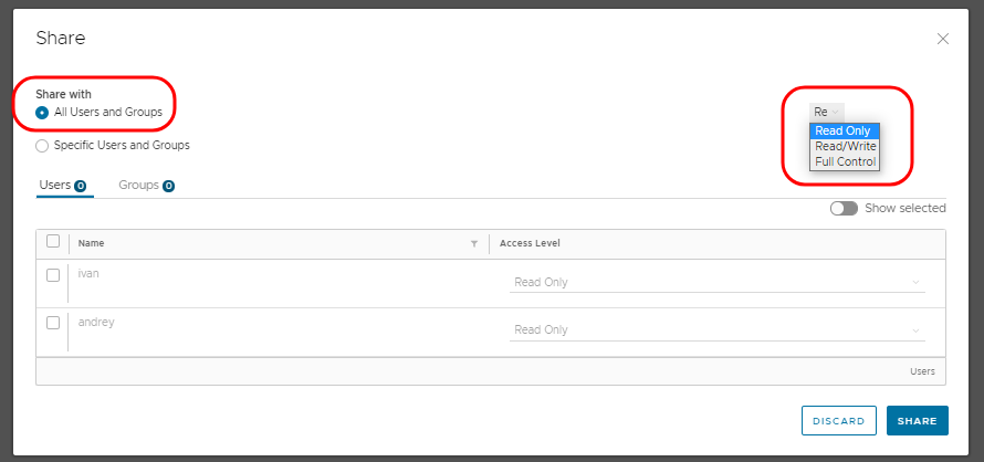 Инструменты блока позволяют применить права доступа к VM как ко всем пользователям и группам, так и выборочно. Для выдачи прав всем пользователям и группам выберите пункт All Users and Groups и одно из значений списка: