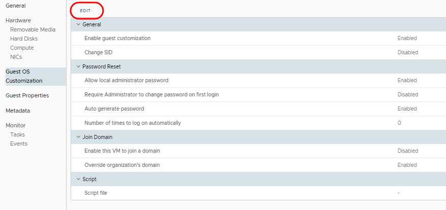 Основные настройки (General), аппаратные настройки (Hardware), настройки гостевой ОС (Guest OS Customization), настройки гостевого входа (Guest Properties), настройки метаданных (Metadata), мониторинг заданий и событий (Monitor).