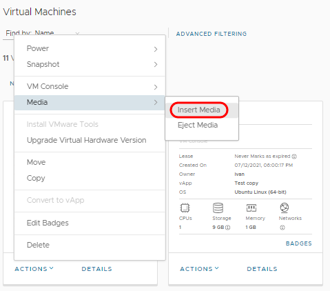 В подразделе Removable Media отображаются подключенные к виртуальным приводам образа. Сами образа подключаются через карточку VM: Actions → Media → Insert Media.