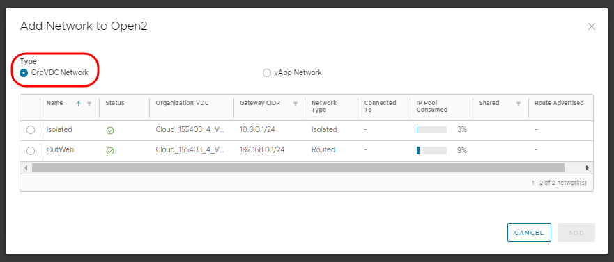 При выборе пункта OrgVDC Network раскроется список сетей, доступных для подключения. Сети должны быть заранее созданы и настроены в разделе Networks.