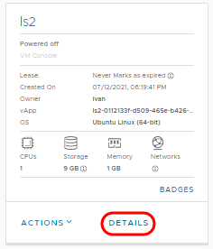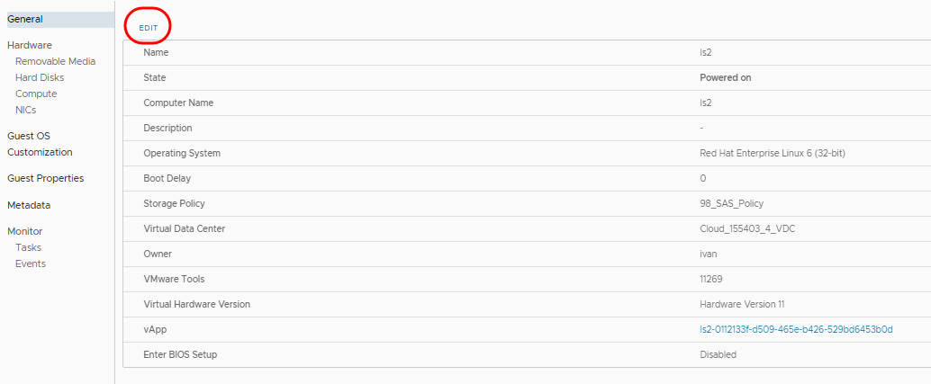 Cloud Director предоставляет возможность гибкой настройки каждой VM. Опции настройки VM располагаются в разделе Details.
