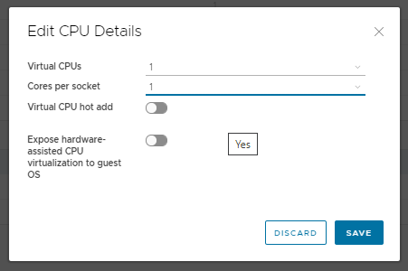 Далее расположен блок настройки CPU. Здесь мы можем задать количество виртуальных процессоров, ядер на процессор, настроить горячие добавление виртуальных процессоров и предоставление аппаратной виртуализации CPU для гостевой ОС.