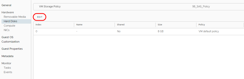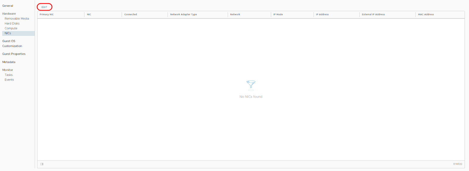 Следующий подраздел — настройка сетевой карты. По умолчанию список сетевых устройств VM пуст. Чтобы добавить сетевое устройство и настроить подключение VM к сети или виртуальной сети vAPP — нажмите EDIT.