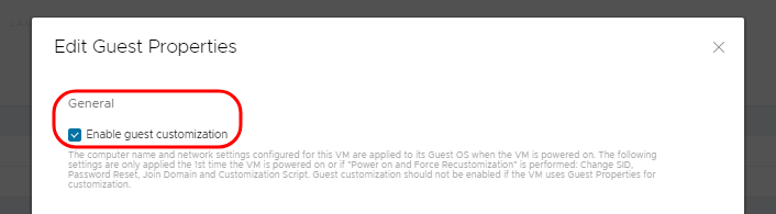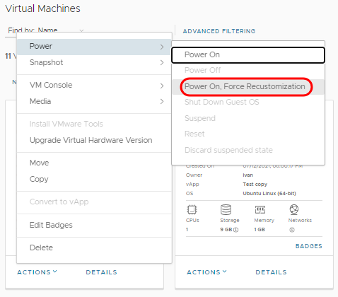 Важно! После применение любых настроек VM, её нужно запускать через меню Power в режиме Power On, Force Recustomization.