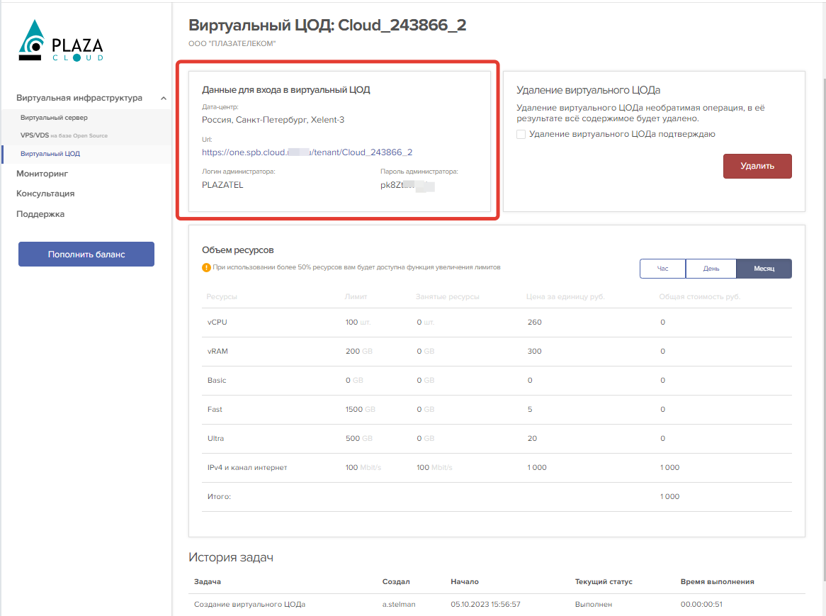 Рядом со ссылкой находятся данные для входа в vDC: логин и пароль администратора.