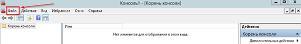 В открывшемся окне Консоль1 (Console1), откройте меню Файл (File) и выберите пункт Добавить или удалить оснастку (Add/Remove Snap-in).