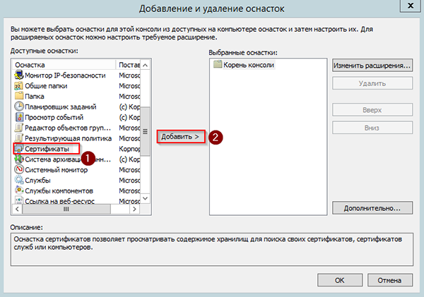 В левой части открывшегося окна выберите пункт Сертификаты (Certificates) и нажмите кнопку Добавить (Add) по центру экрана.
