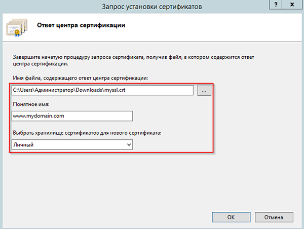 - Имя файла, содержащего ответ центра сертификации (File name containing the certificate authority's response): выберите расположение полученного от центра сертификации файла SSL-сертификата (.crt) и нажмите Открыть (Open).