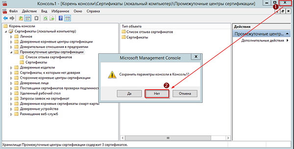 В той же Консоли 1 (Console 1) выберите пункт Промежуточные центры сертификации (Intermediate Certification Authorities), кликните на него правой кнопкой мыши - Все задачи (All tasks) - Импорт (Import).