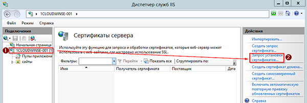 В панели Действия (Actions) в правой части окна выберите пункт Запрос установки сертификатов (Complete Certificate Request).