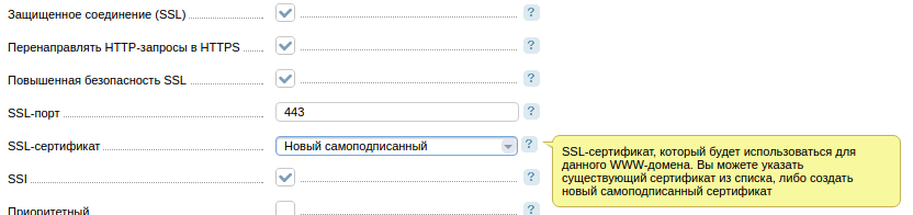 В открывшемся окне напротив пункта «Защищенное соединение (SSL)» поставьте галочку. На Ваше усмотрение отметьте пункты «Перенаправлять HTTP-запросы в HTTPS» и «Повышенная безопасность SSL». Укажите порт в поле «SSL-порт», по умолчанию 443. В выпадающем списке выберете созданный сертификат для Вашего домена.