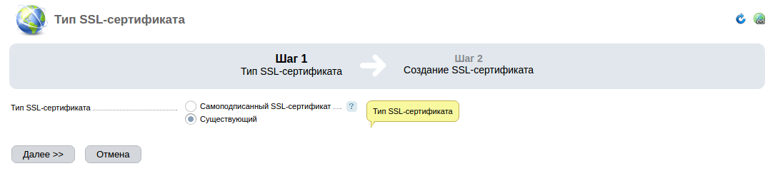 Выберете тип сертификата «Существующий».