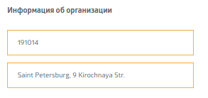 В форме “Информация об организации” введите почтовый индекс и почтовый адрес организации.