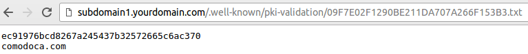 | subdomain2.yourdomain.com/.well-known/pki-validation/9E107D9D372BB6826BD81D3542A419D6.txt | 87428fc522803d31065e7bce3cf03fe475096631e5e07bbd7a0fde60c4cf25c7 comodoca.com |