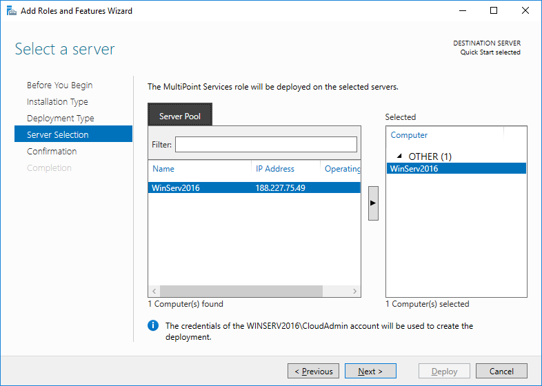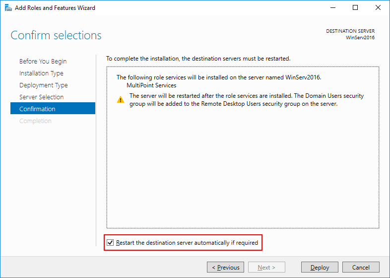 На следующем шаге отметьте галочкой пункт об автоматической перезагрузке сервера после установки службы и нажмите Deploy.