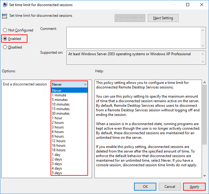 - Set time limit for disconnected sessions (Задать ограничение по времени для отключенных сеансов) - опция задает таймаут для завершенных сеансов.
