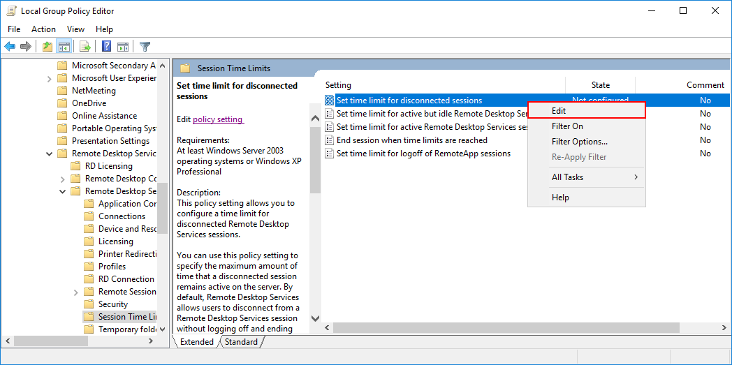 (Computer Configuration\Policies\Administrative Templates\Windows Components\Remote Desktop Services\Remote Desktop Session Host\Session Time Limits)