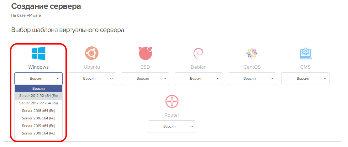 Перейдите в раздел Виртуальный сервер на базе VMware, кликните на кнопку Создать сервер и выберите шаблон ВМ WIndows под управлением Windows Server 2019 x64 (En или Ru).