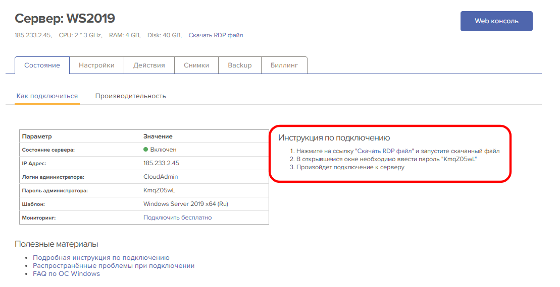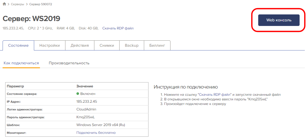 После создания сервера к нему можно подключиться по RDP. Для этого скачайте RDP-файл из вкладки Состояние.